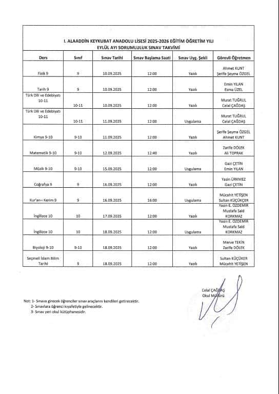 2025-2026 Eğitim Öğretim Yılı Sene Başı Sorumluluk Sınav Takvimi